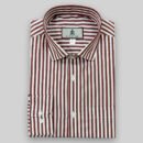 The shirt features crisp, prominent maroon (or deep reddish-brown) stripes alternating with clean, bright white stripes. This high-contrast pattern creates a visually striking effect that is both professional and fashion-forward.